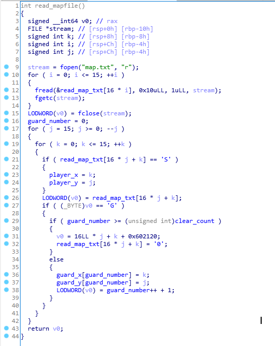 read_mapfile은 map.txt에서 데이터를 읽어와 maze를 구축하고 글쓰다보니 알았는데, read_mapfile이 아니라 readLocation_player_guard가 정확한 함수명이 될 것 같다. 이 함수는 map.txt에서 플레이어, guard의 좌표값을 받아온다.
