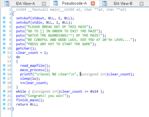 1. 코드 흐름에서 본 clear_count는 우리가 달성한 레벨을 담아놓는 변수인데, 저 변수가 20이 넘을 경우 스테이지를 모두 클리어했다고 판단하고 finish_maze()를 실행한다.